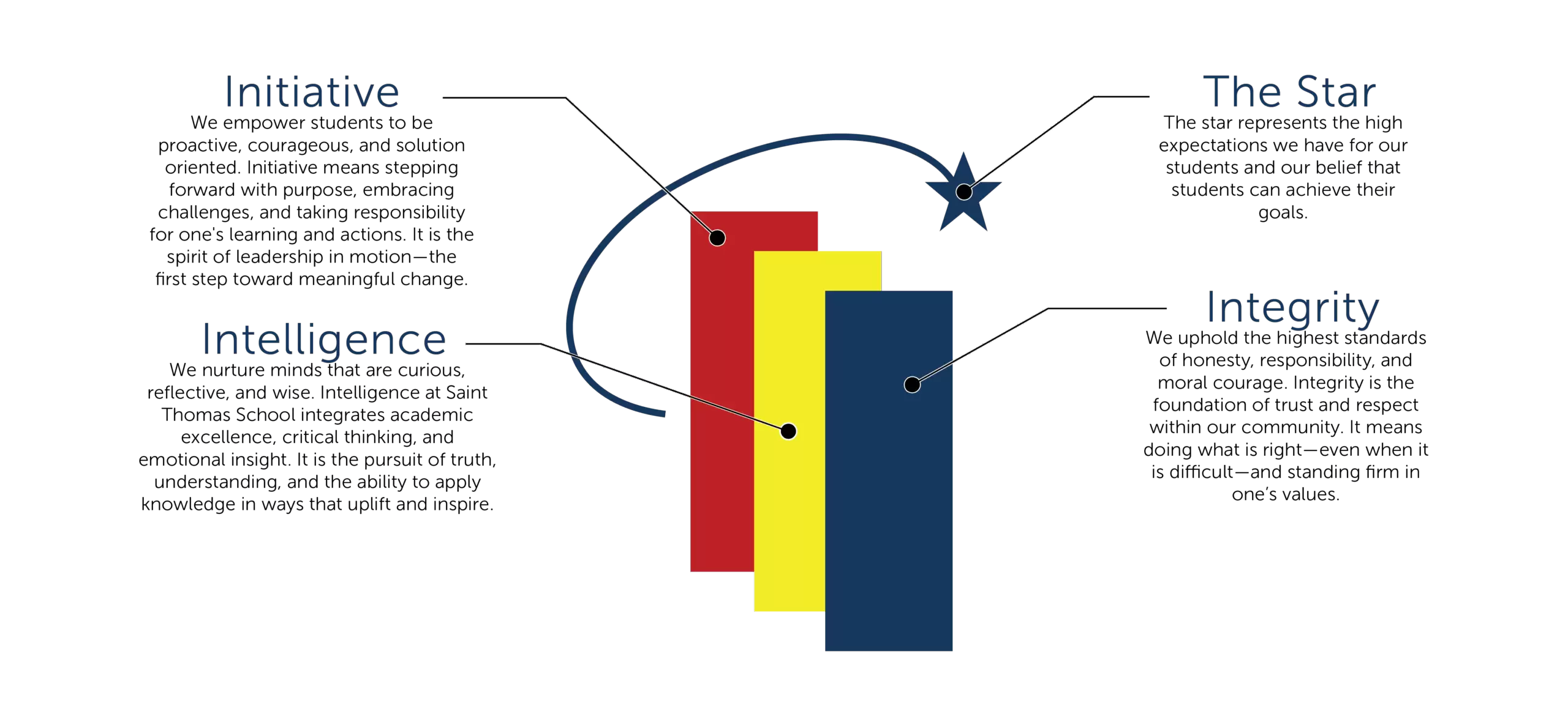 Our school logo is composed of three pillars embraced by the trail of a star. What do each of the pillars and the star mean?